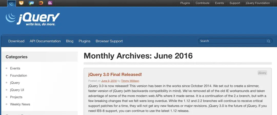 怎麼樣?有沒有一種魔獸懷舊服的感覺?估計也是目前時間最長的單版本更新記錄了,當然jQuey也是目前前端維護時間最長的一個庫了,就算包含框架也是,因為畢竟人家佔位早啊。值得一提的是一起同時期的MooTools庫早就斷更了,