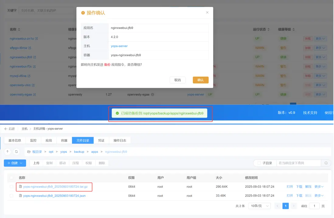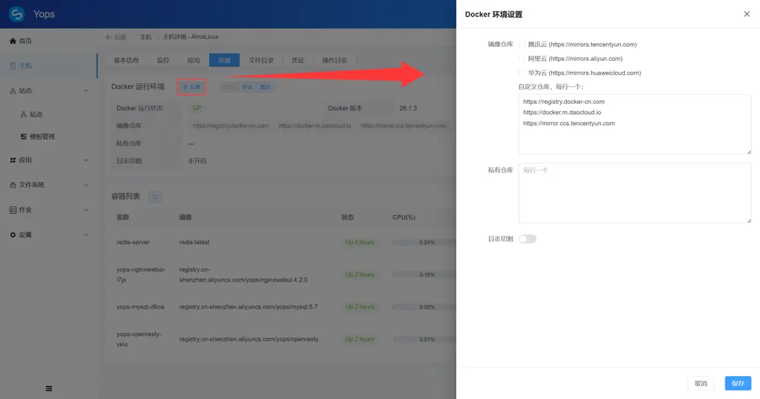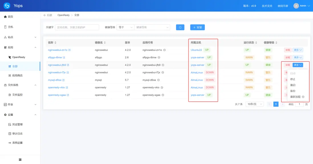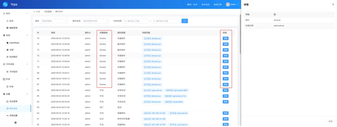 Yops 運維面板通過 單主機維度應用維度 的容器管理,輔以審計日誌與作業模塊,提供了全流程的可視化解決方案: