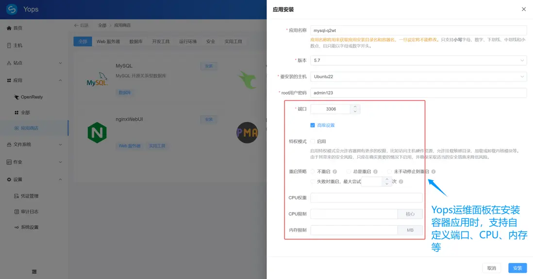 • 安裝即配置:在應用安裝時,支持指定應用部署到哪台服務器,支持直接設置 CPU/內存最大值以及指定端口,避免後期因端口衝突或資源分配不合理導致的故障。