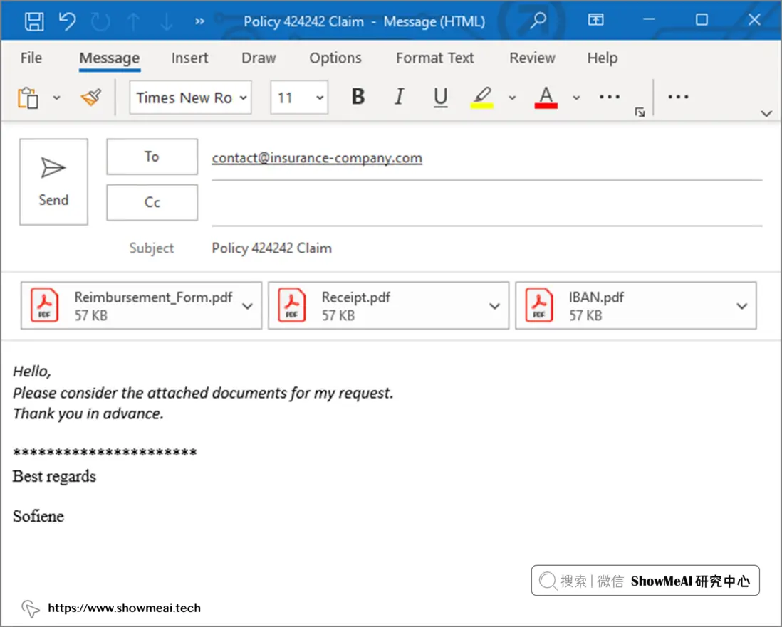 假設一家保險公司客户,想申請理賠與報銷。 這個場景下他會填寫保險報銷表,並將其連同藥物收據和銀行 ID 文件附在電子郵件中。可能的一個電子郵件可能長這樣: