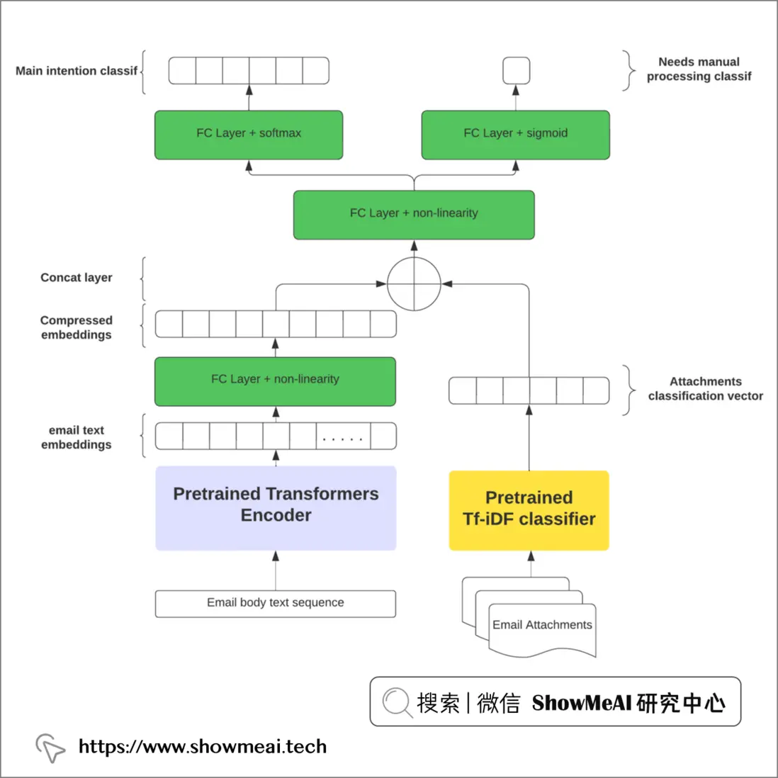 我們涉及到2類輸入:電子郵件正文 和 附件,在深度學習場景下,我們都需要對它們做向量化標準。如下圖的架構是一個可行的嘗試方案:我們用transformer類的模型對正文進行編碼和向量化標註,而對於附件,可以用相對簡單的NLP編碼器,比如TF-IDF。