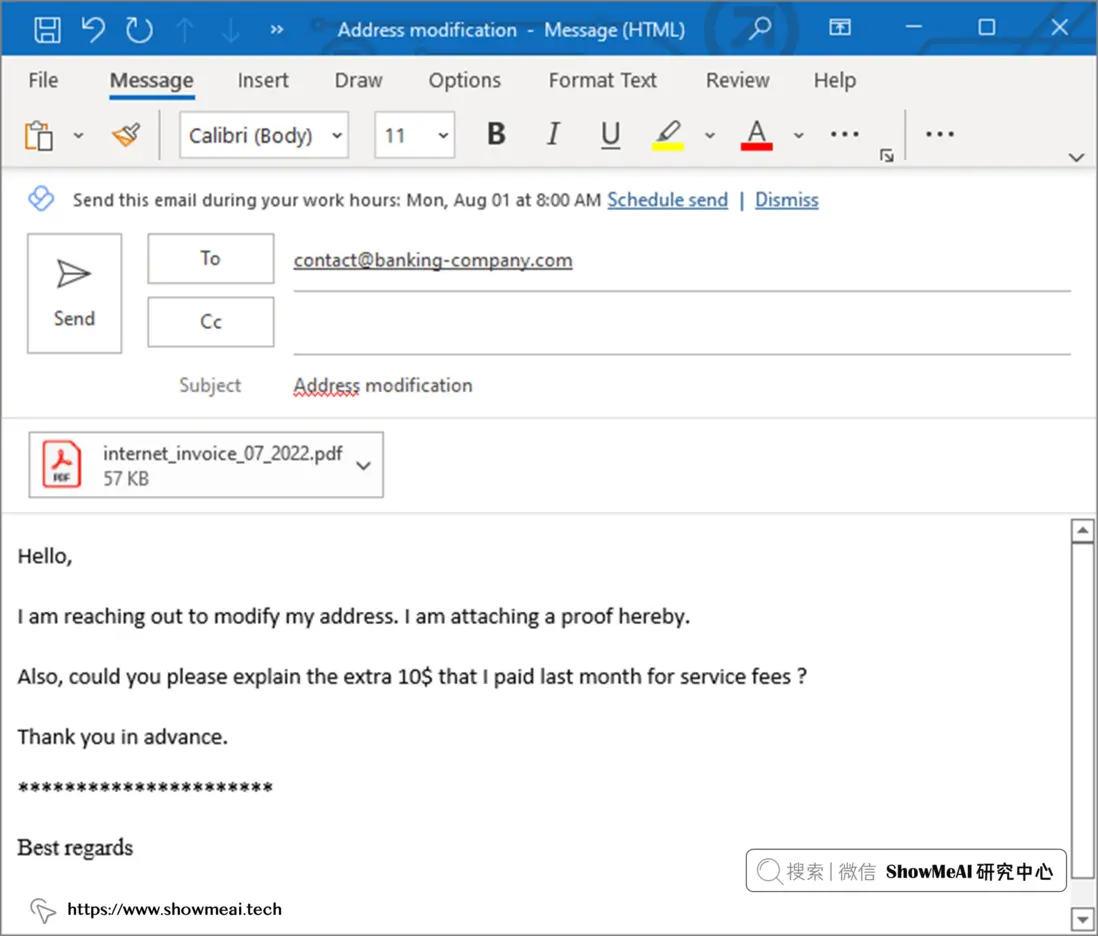 假設一家銀行的客户,搬家並對之前的某項服務費有疑問。 如果選擇發送電子郵件來進行申請和處理,郵件可能長這樣: