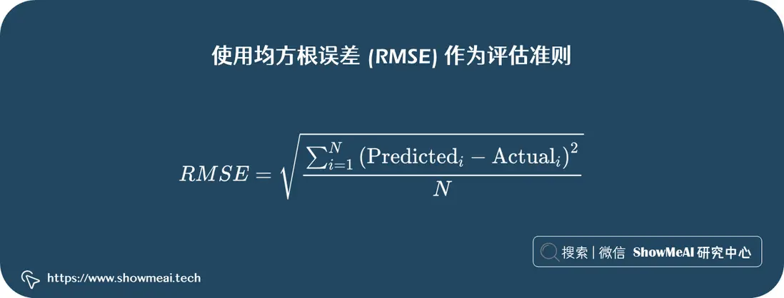 這裏我們使用的均方根誤差 (RMSE) 作為評估準則,它計算的是訓練數據和測試數據上『標準答案』和『預估值』的偏差平方和與樣本數 N 比值的平方根。 即如下公式: