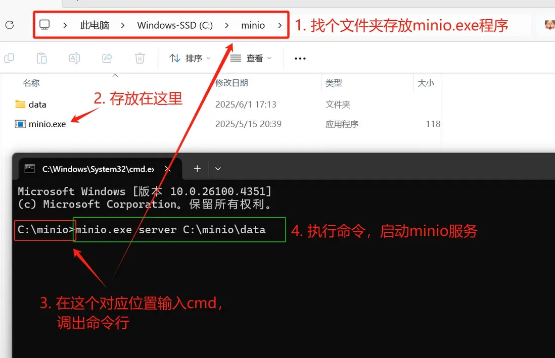 minio.exe程序,放在我的C盤下的,新建的minio文件夾裏面 - 然後在當前目錄下,使用cmd打開命令行,並輸入命令