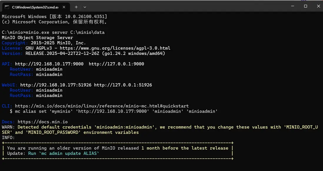 minio.exe server C:\minio\data後 - 出現如下圖,就表明啓動成功了