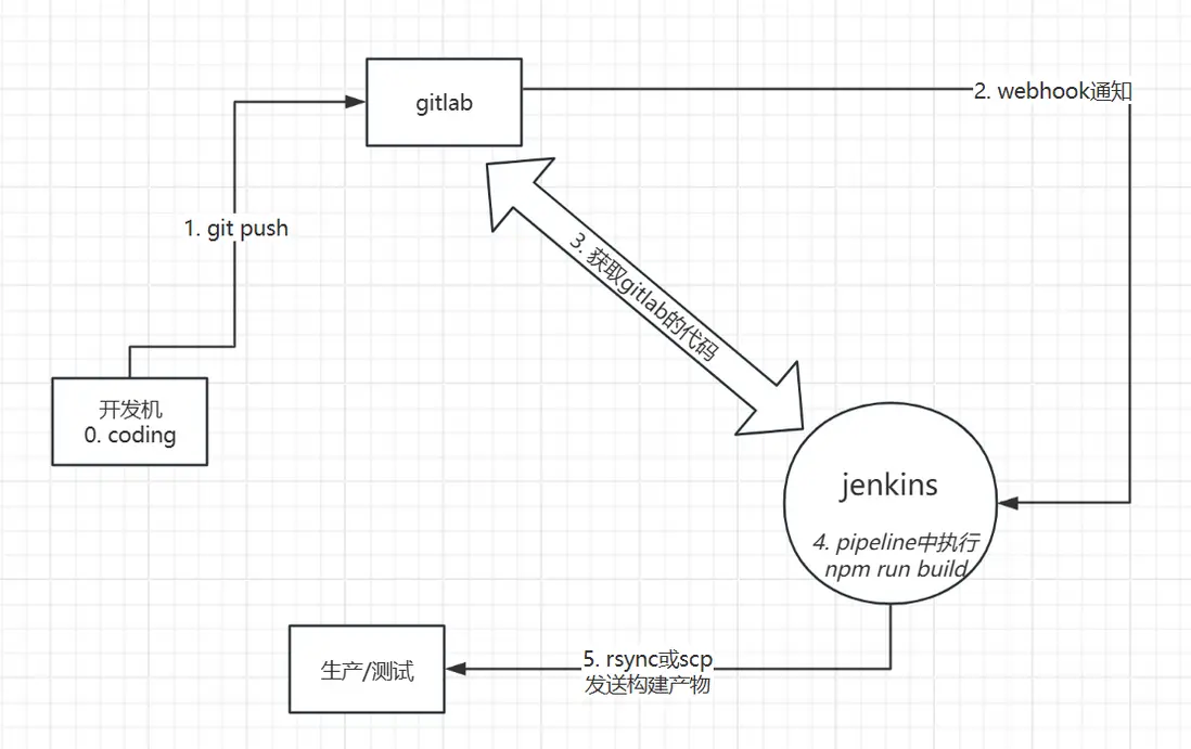 git push把本機代碼推送到gitlab服務器) gitlab服務器——用來存代碼(注意,gitlab上面的代碼,一般無法直接push到jenkins服務器上,需要jenkins主動從gitlab那裏去“撈”代碼)jenkins服務器——用來執行自動化cicd操作(jenkins把“撈”到的代碼執行npm run build構建操作,並把構建產物傳送到生產服務器)- 生產服務器——存放前端構建產物,並使用