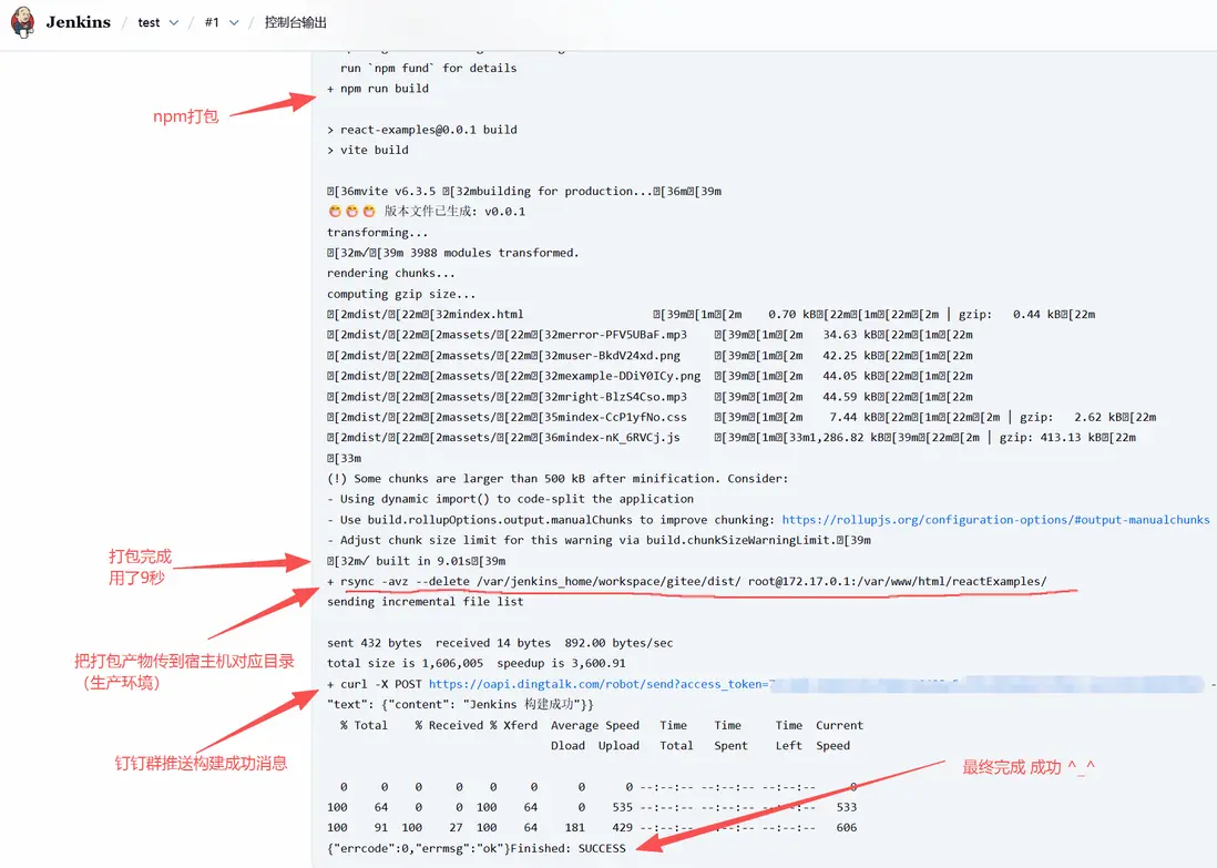 意思是:將容器內jenkins工作空間目錄/var/jenkins_home/workspace/gitee/dist/ 的文件(裏面的html、css、js),同步到宿主機(IP 為 172.17.0.1)的 /var/www/html/reactExamples/ 目錄,並且保持兩者內容完全一致(會刪除宿主機上多餘的文件)