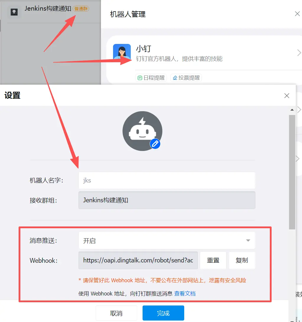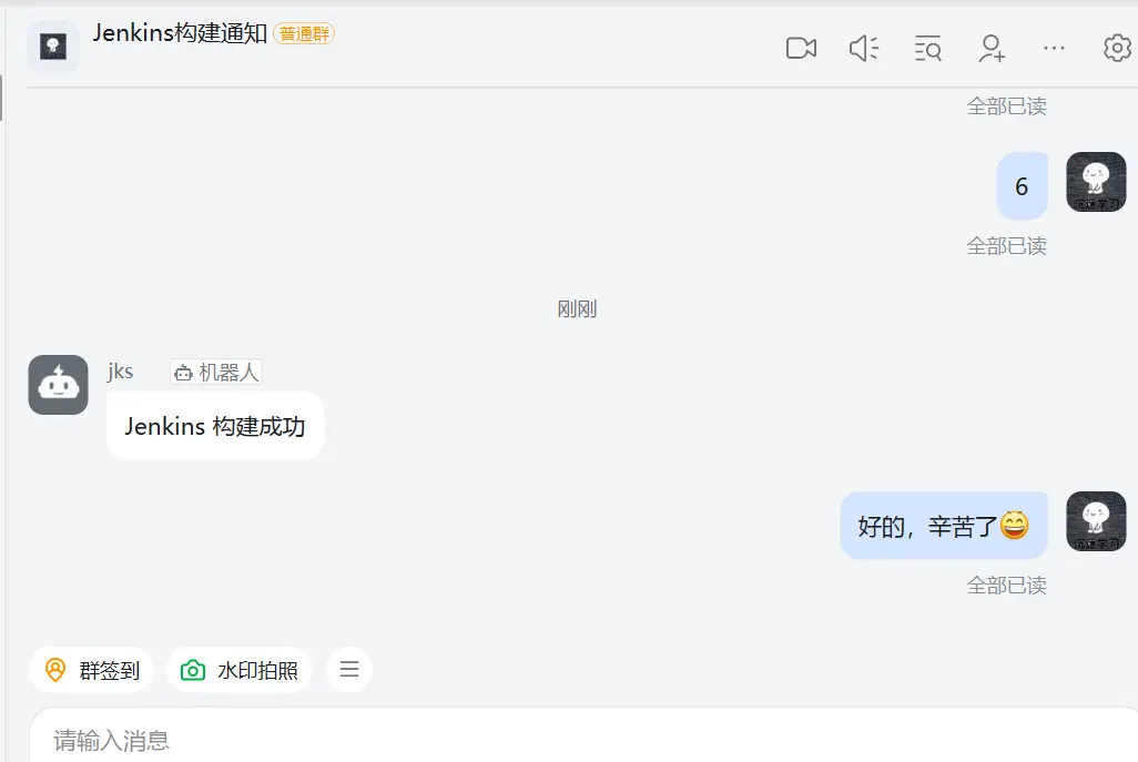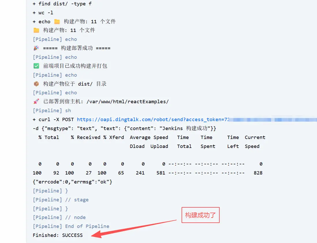 curl -X POST "https://oapi.dingtalk.com/robot/send?access_token=access_token" -H "Content-Type: application/json" -d "{\"msgtype\": \"text\", \"text\": {\"content\": \"Jenkins 構建成功\"}}"