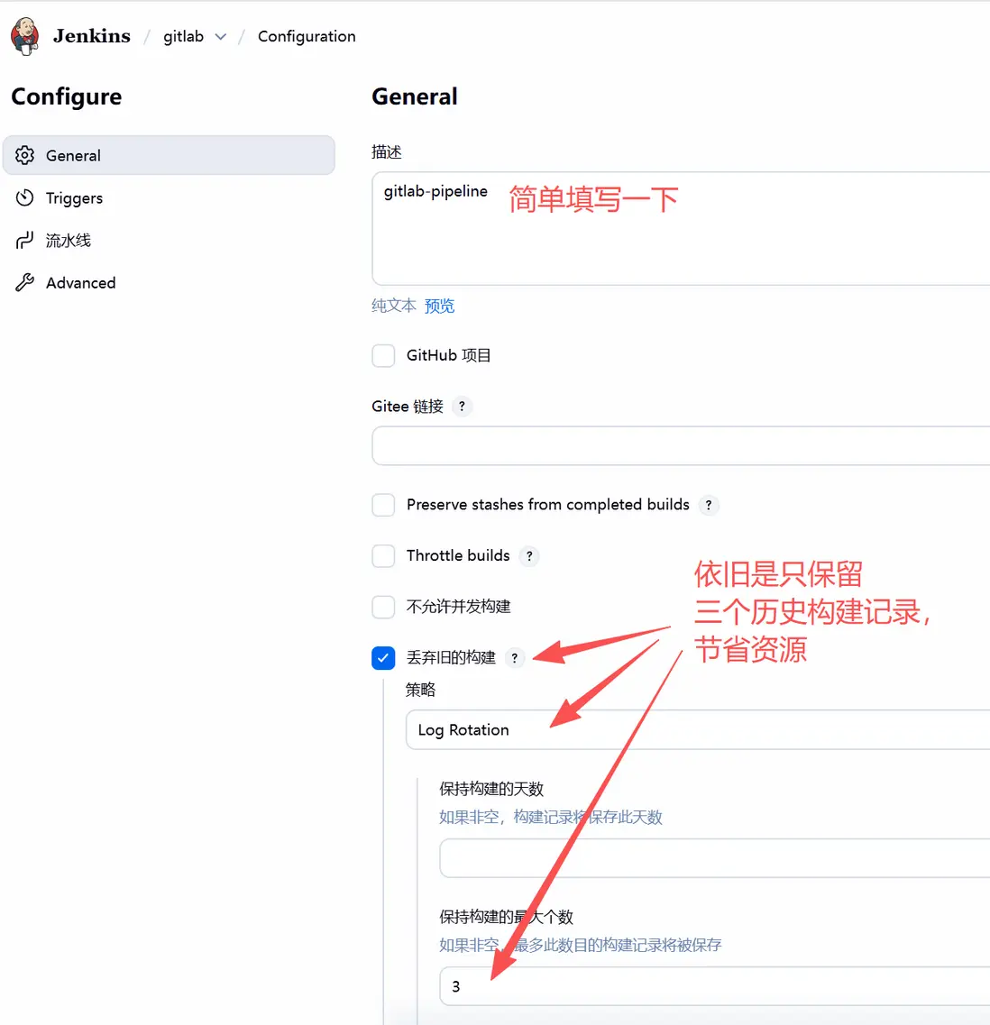 然後填寫項目描述,丟棄舊的構建,只保留三個歷史構建結果