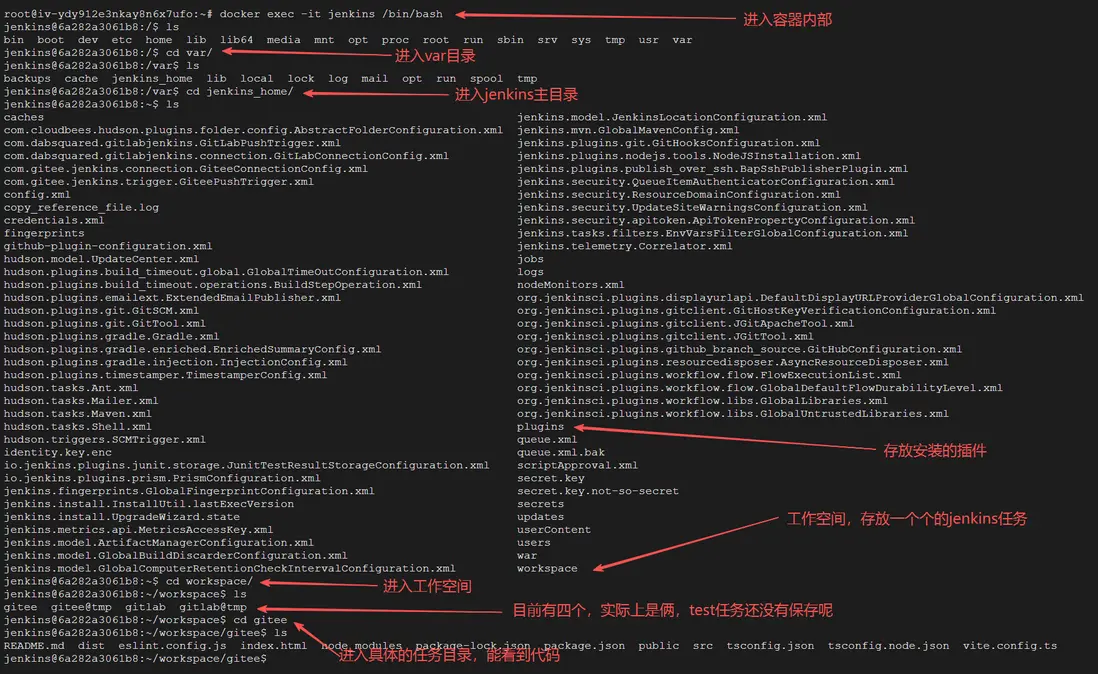 因為筆者的jenkins是通過docker部署的,所以進入這個docker容器內部,能看到一些jenkins具體信息,比如工作空間