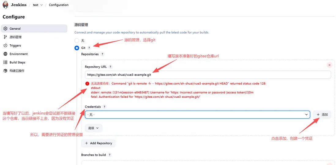 選擇git,填寫gitee倉庫,並準備新建憑證,並使用這個憑證