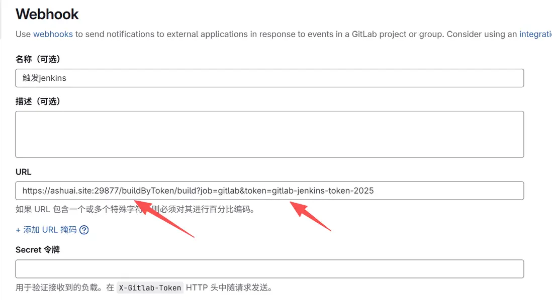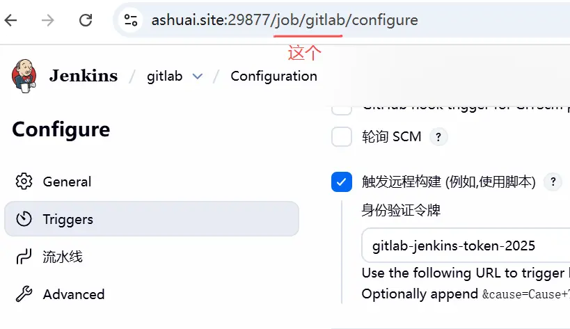 https://ashuai.site:29877/buildByToken/build?job=gitlab&token=gitlab-jenkins-token-2025- 使用/buildByToken/build這種方式,一定要搭配Build Authorization Token Root Plugin插件