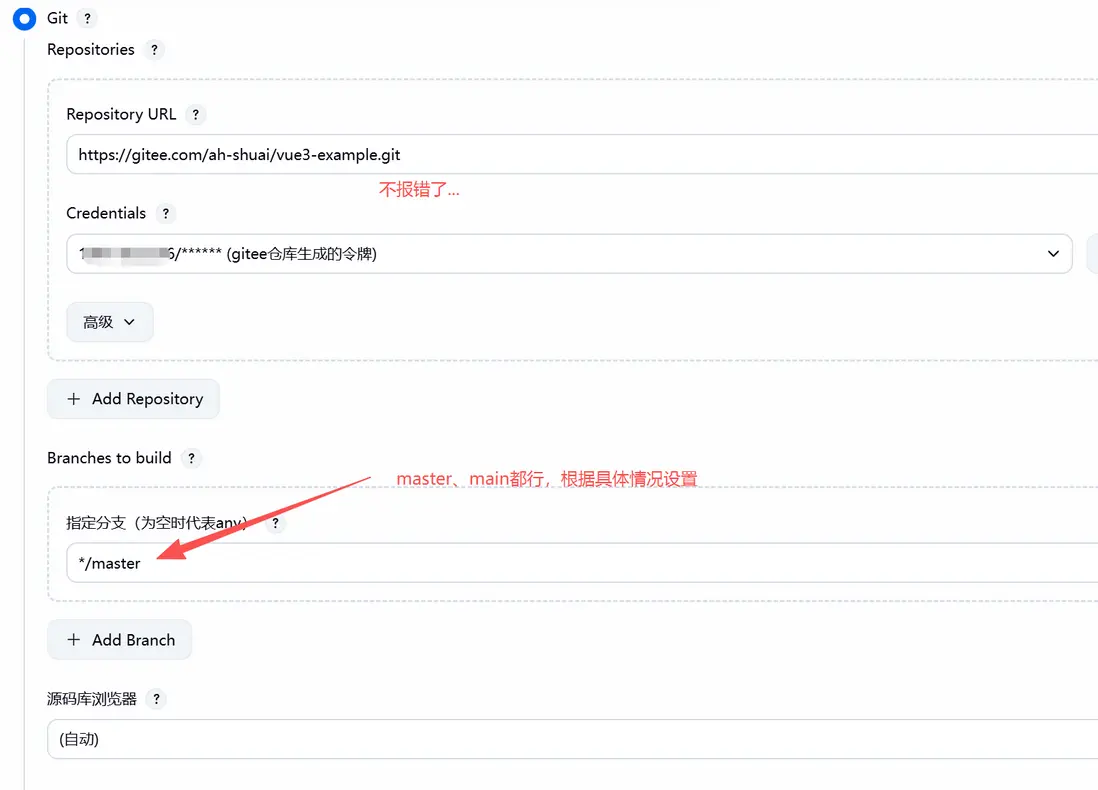 指定master分支的代碼,為構建分支代碼(就是jenkin會通過上述的認證,讓gitee允許它進行代碼拉取操作,拉取master分支代碼)