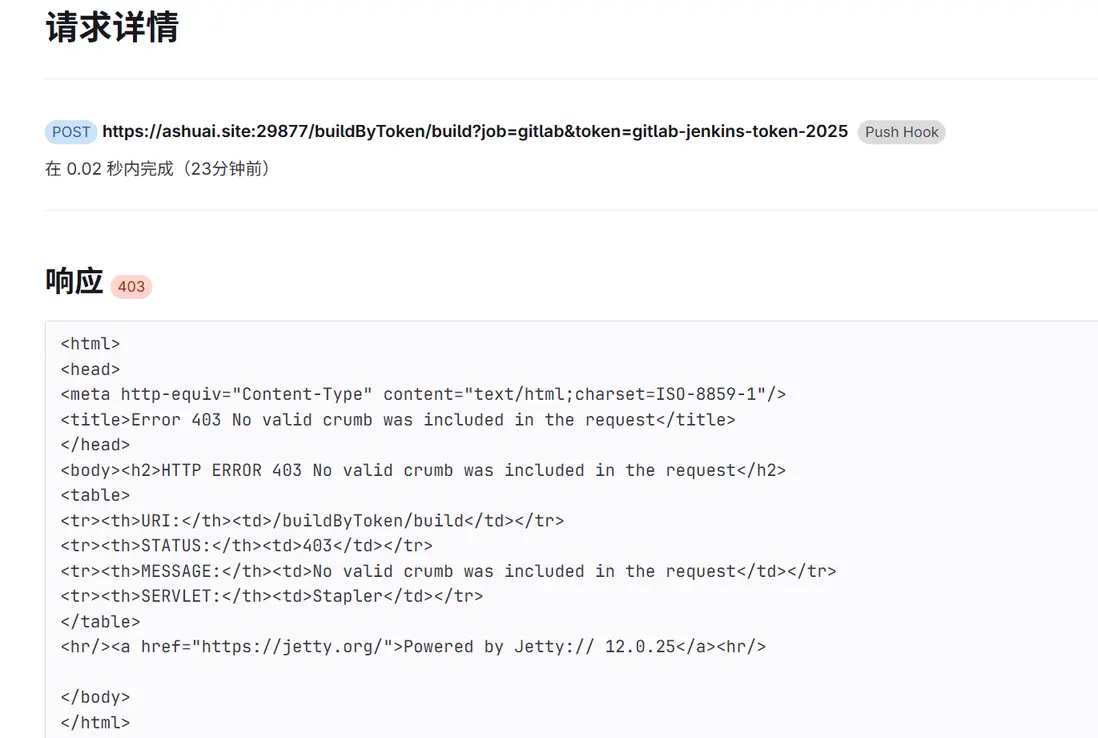 - 否則會403錯誤,這個是jenkins的安全策略,如下報錯圖