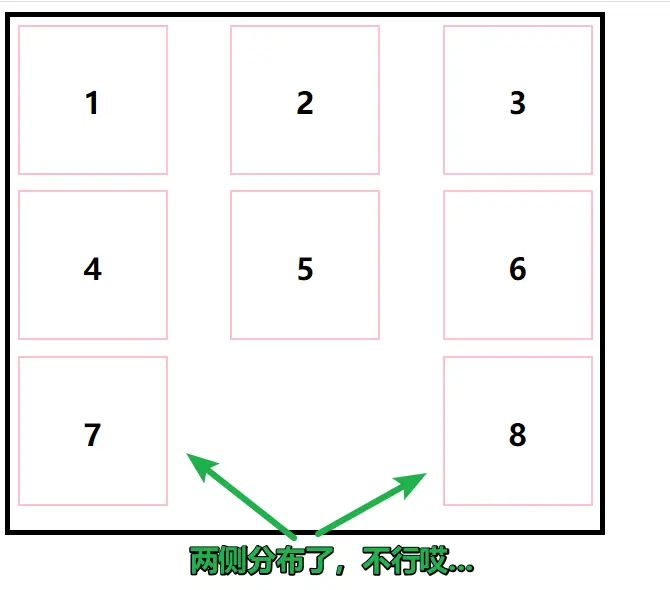 如果是正好9個項,那這種寫法沒有問題,如果是8個項,最後一行的7和8就會兩側分佈了,如下圖: