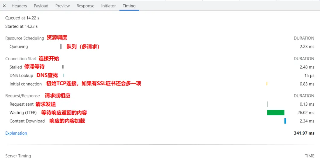 點開請求的Timing面板查看,發現請求卡在Connection Star的Initial connection地方不往下走了。