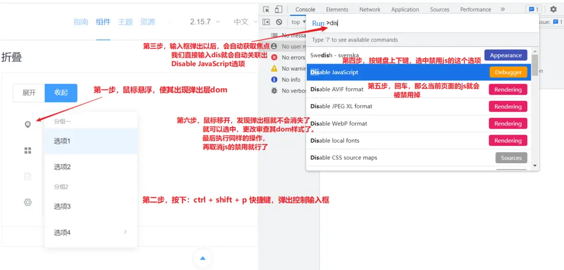 比如el-menu鼠標懸浮出現二級彈框內容,但是鼠標移動走,二級彈框就消失了,這樣就不太方便我們審查元素樣式。於是乎,我們可以這樣操作,圖示如下: