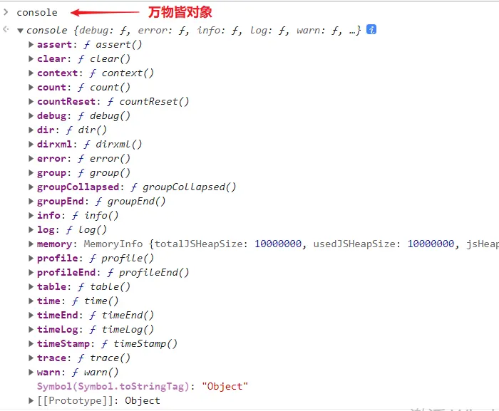 js中也有萬物皆對象的定義,所以我們常用的console也是一個對象,自然是對象,那麼其身上就會自帶一些方法和屬性。大家F12打開控制枱以後,直接輸入console回車,就可以看明細啦,如下圖: