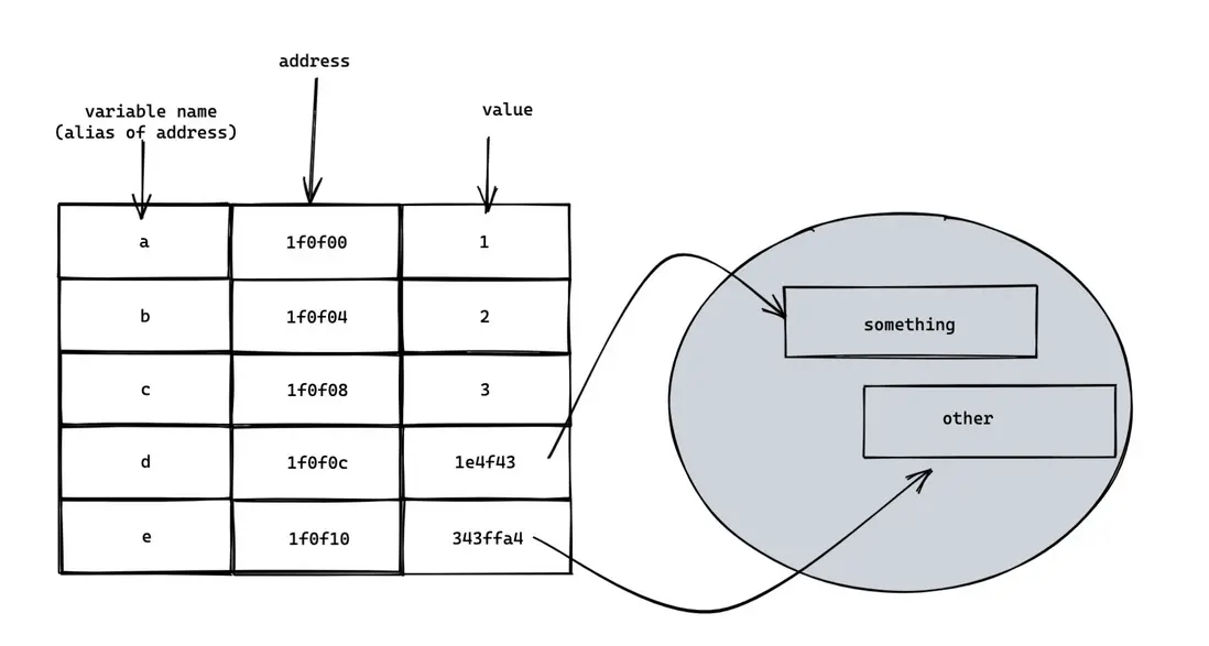 由於 d 和 e 的值是引用類型,數據長度不確定,因此實際上數據區域會指向堆上的一塊區域。而 a,b,c 由於長度是編譯時確定的,因此可以方便地在棧上存儲。