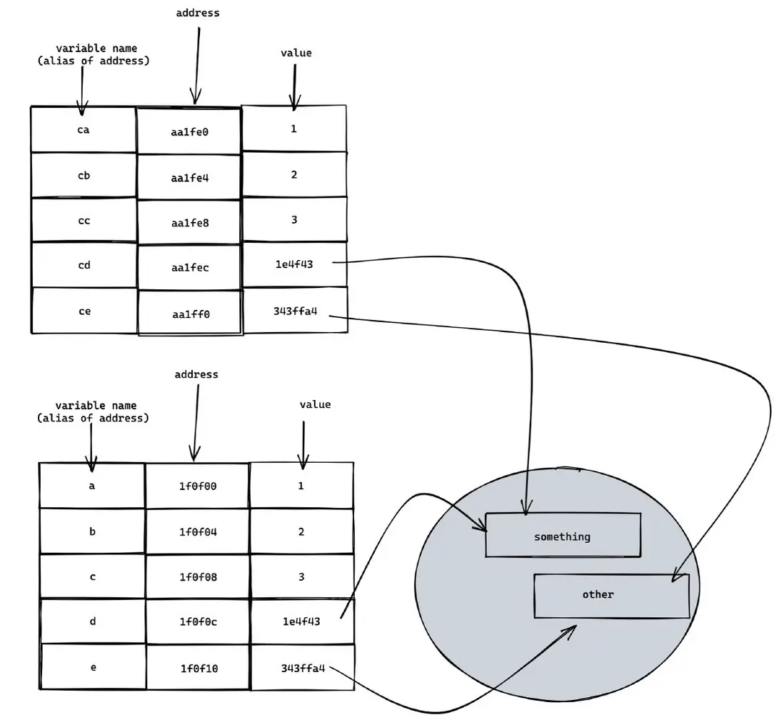 可以看出,ca,cb,cc,cd,ce 的內存地址都變了,但是值都沒變。原因在於變量名只是內存的別名而已,而賦值操作傳遞的是 value。