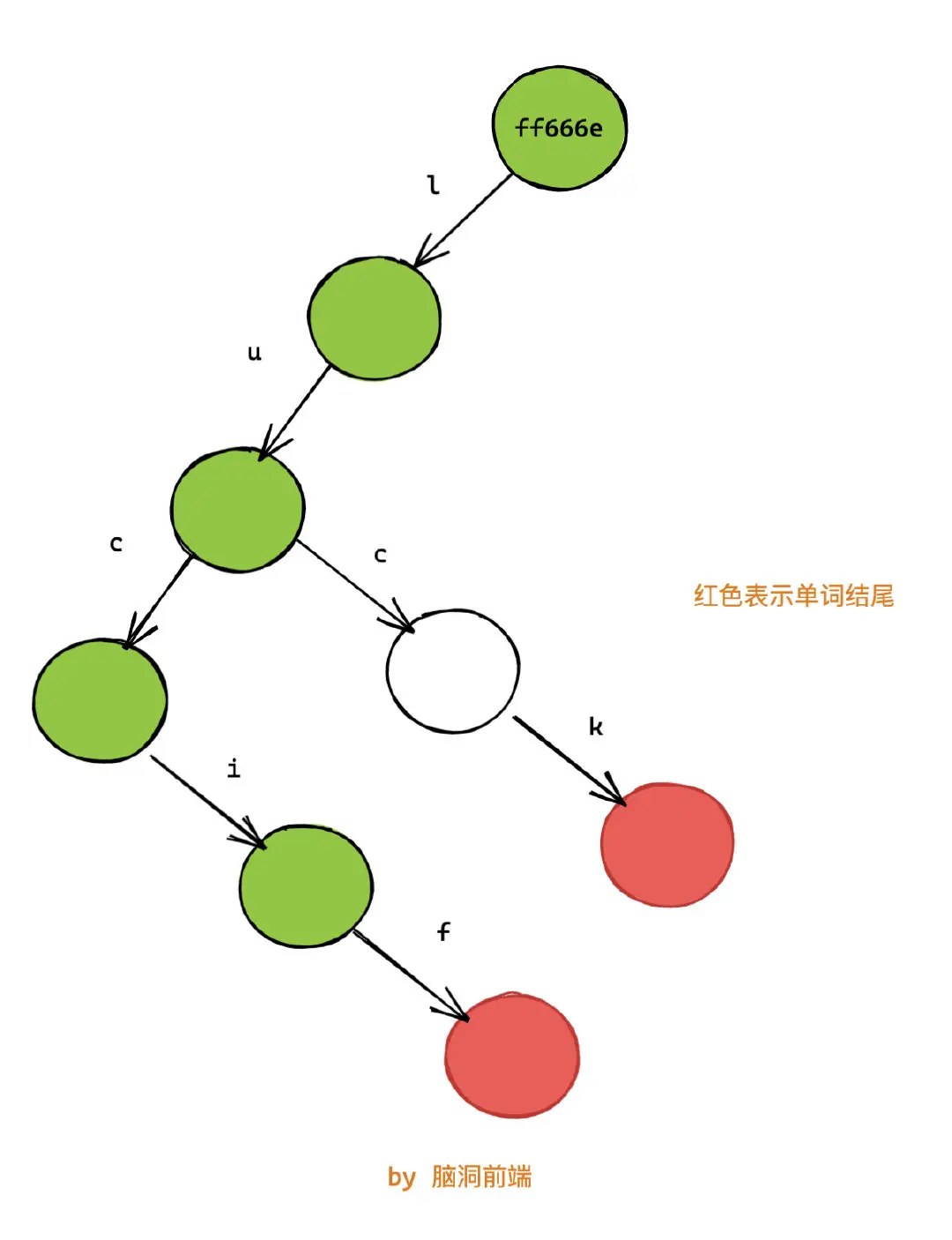 這樣我們就將兩個單詞 lucif 和 luck存到了樹上: