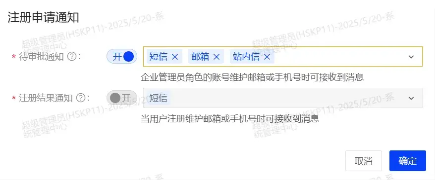 ◈ 註冊申請通知: 用户提交註冊申請後,企業管理員收到待審批的提醒;以及註冊成功或失敗也支持發消息通知到用户,多渠道自動觸達。