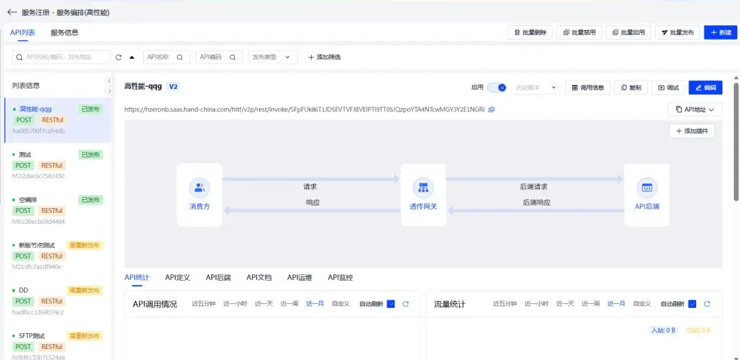 高性能編排保存發佈時會往接口服務自動註冊接口且一個接口對應唯一一個編排,服務代碼為:ORCHESTRATION_SONIC,接口代碼和接口名稱分別對應編排編碼和編排名稱。