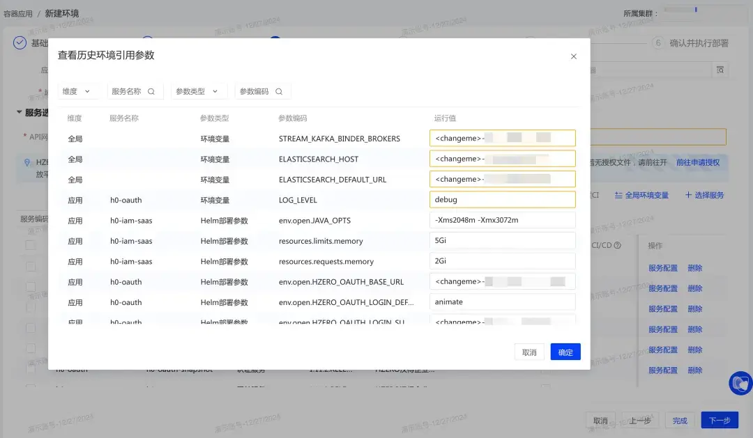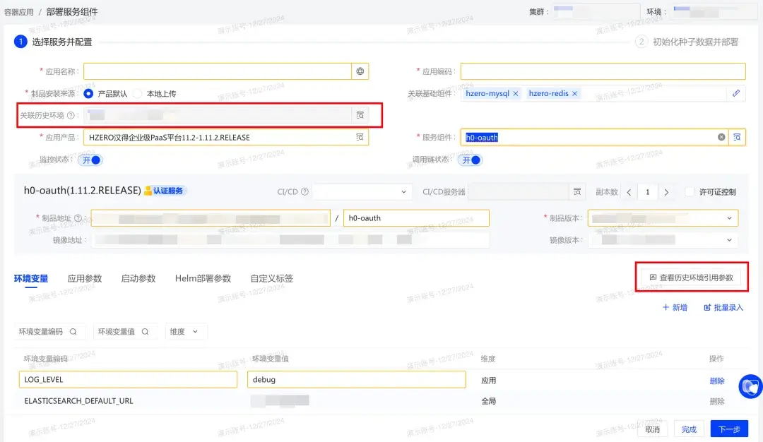 系統將會自動匹配關聯歷史環境中的相關服務,並自動繼承相關服務配置(例如:應用參數、啓動參數、部署參數、環境變量等。)