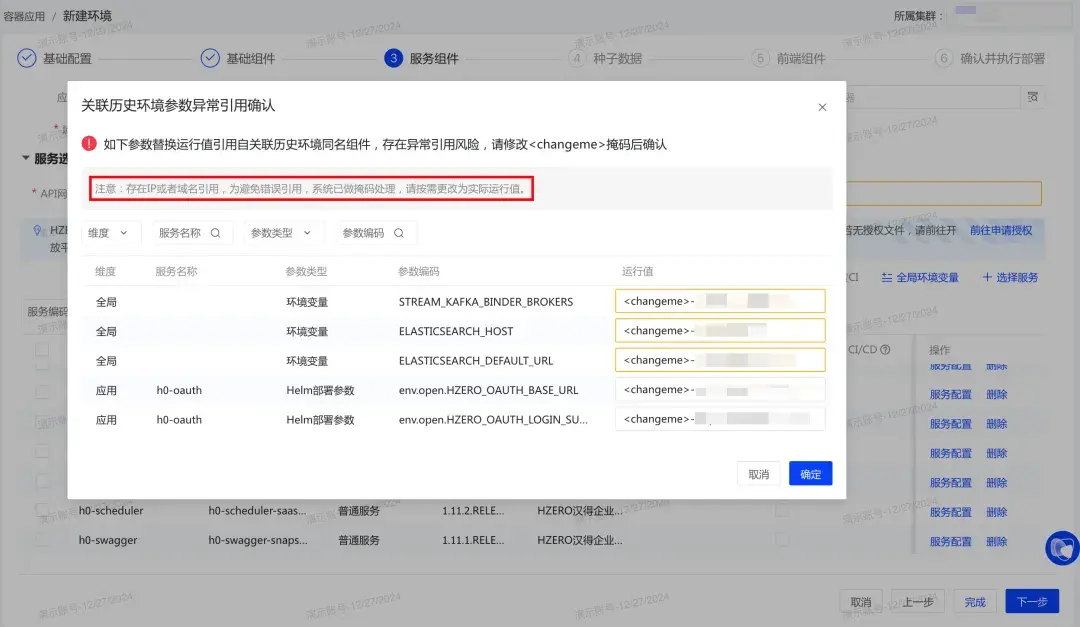 另外,我們注意到某些參數引用值攜帶<changeme>-前綴掩碼,繼續下一步時,系統將會自動校驗用户必須手工確認並更改這些參數值(此類參數一般與特定環境相關,不能直接繼承複用),防止錯誤引用原環境信息!