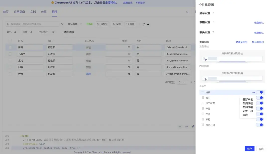 - 新增個性化列顯隱、列置底功能以及序號列順序調整,滿足企業表格多樣的個性化管理需求
