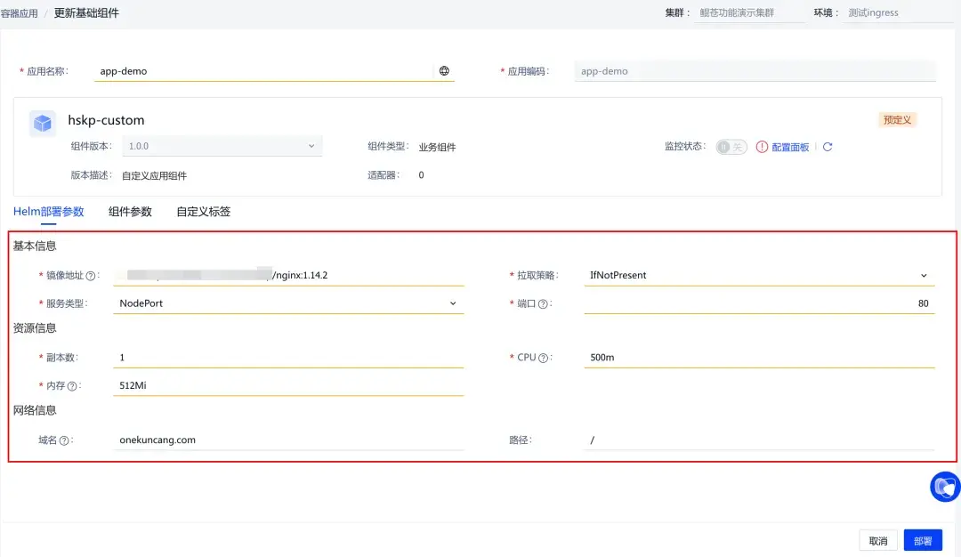 部署基礎組件,一鍵表單可視化部署。只需要填寫必要參數信息即可,例如,鏡像、端口、副本數、域名等