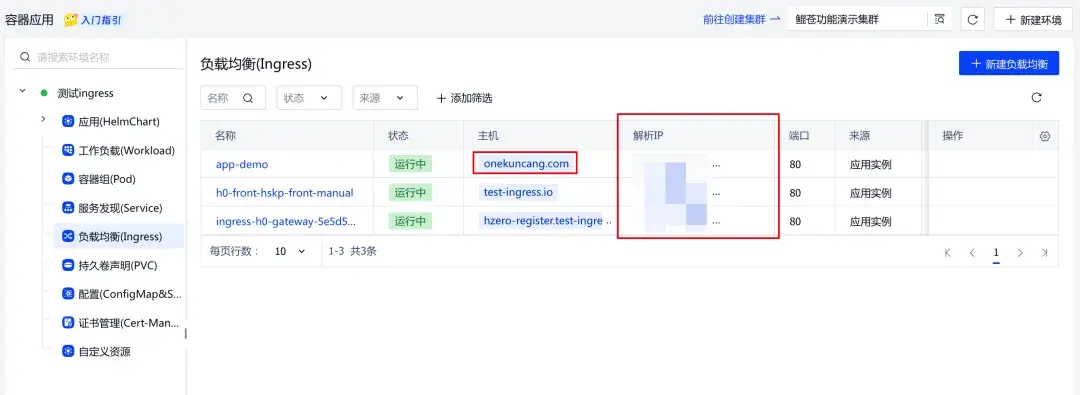 我們如上部署時配置了域名,系統自動幫我們創建了負載均衡資源,可以通過域名方式訪問,如下,將 主機 列的域名解析到 解析IP 上即可