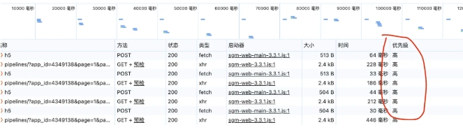 XMLHttpRequest和Fetch沒有什麼太大本質的區別屬於一類,他們都是比較常規的上報形式,但是他有個致命問題可能會被中斷,導致數據丟失,特別在頁面跳出的情況,還有就是在請求裏面優先級高,在頁面加載的前期當有大量的上報的時候會阻塞頁面的請求看下圖: