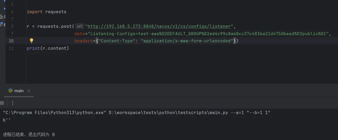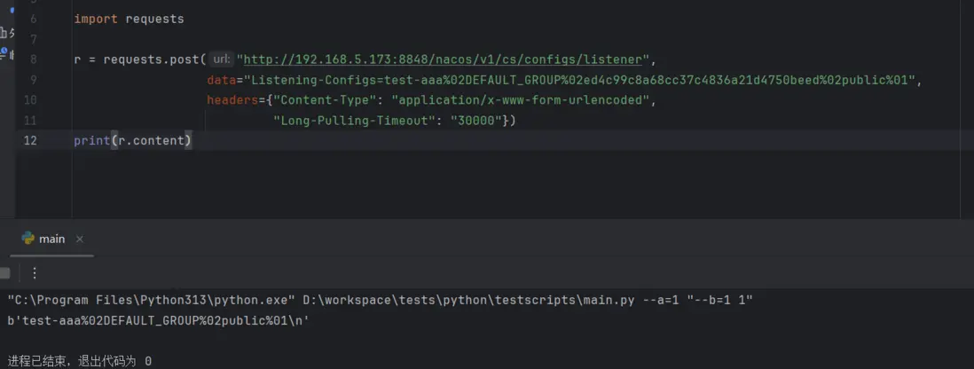 為了進一步調試解決問題,依據 https://nacos.io/zh-cn/docs/open-api.html 文檔中對/nacos/v1/cs/configs/listener接口定義,編寫python腳本單獨調試該接口,