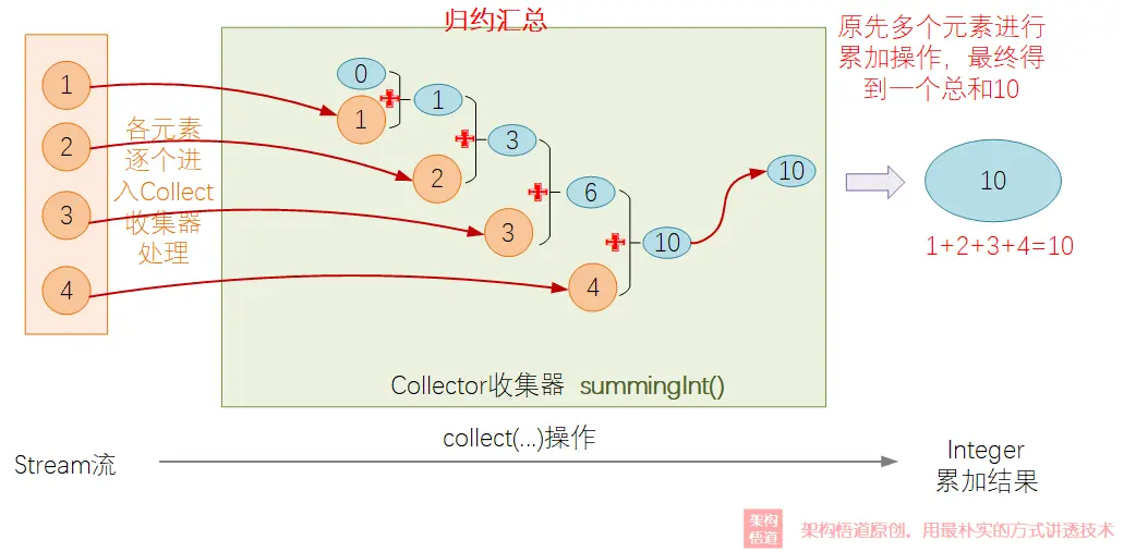 對於歸約彙總類的操作,Stream流中的元素逐個遍歷,進入到Collector處理函數中,然後會與上一個元素的處理結果進行合併處理,並得到一個新的結果,以此類推,直到遍歷完成後,輸出最終的結果。比如Collectors.summingInt()方法的處理邏輯如下: