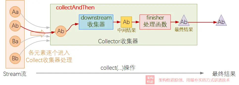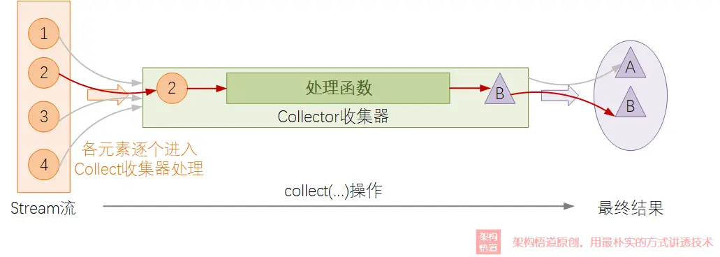到這裏我們可以看出,Stream結果收集操作的本質,其實就是將Stream中的元素通過收集器定義的函數處理邏輯進行加工,然後輸出加工後的結果。