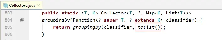 對於groupingBy分組操作而言,分組函數與值收集器二者必不可少。為了方便使用,在Collectors工具類中,提供了兩個groupingBy重載實現,其中有一個方法只需要傳入一個分組函數即可,這是因為其默認使用了toList()作為值收集器: