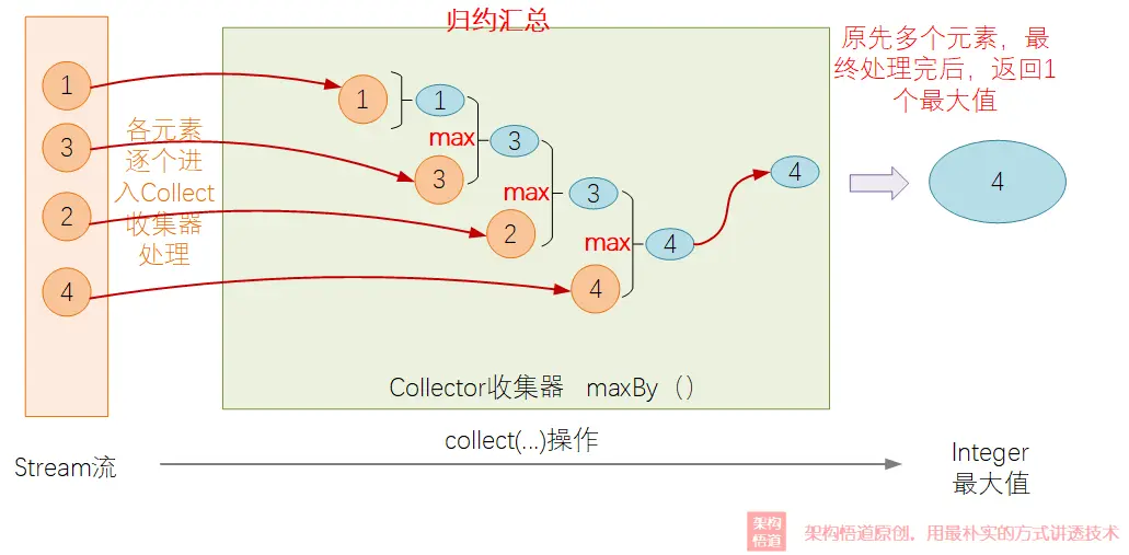 需要注意的是,這裏的彙總計算,不單單隻數學層面的累加彙總,而是一個廣義上的彙總概念,即將多個元素進行處理操作,最終生成1個結果的操作,比如計算Stream中最大值的操作,最終也是多個元素中,最終得到一個結果: