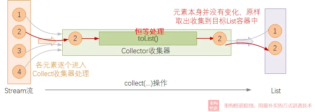 所謂恆等處理,指的就是Stream的元素在經過Collector函數處理前後完全不變,例如toList()操作,只是最終將結果從Stream中取出放入到List對象中,並沒有對元素本身做任何的更改處理: