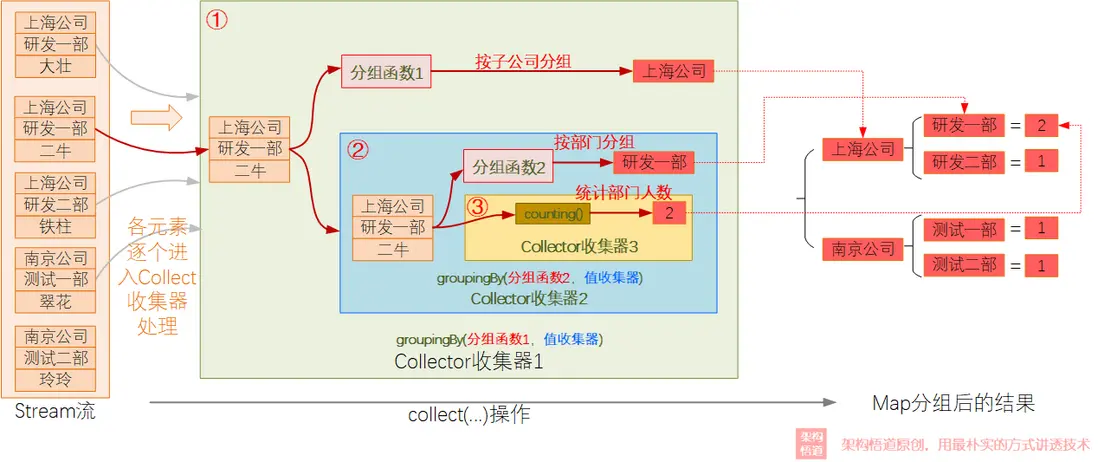 Collectors工具類中提供了groupingBy方法用來得到一個分組操作Collector,其內部處理邏輯可以參見下圖的説明: