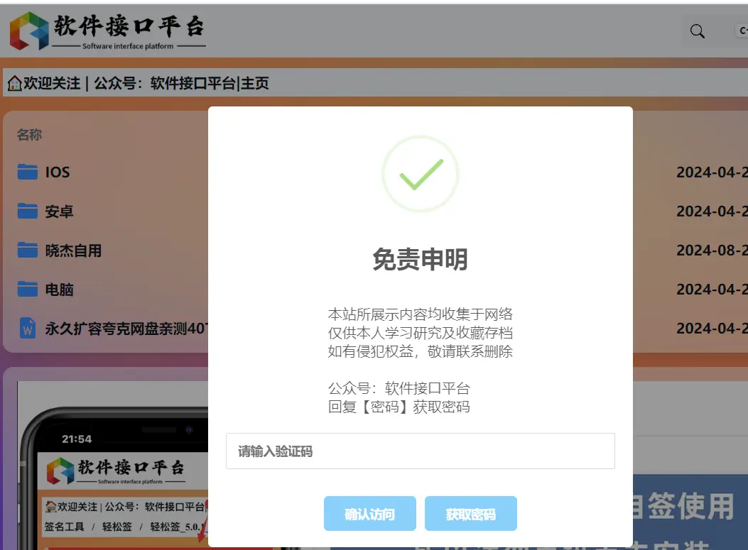text: "\n本站所展示內容均收集於網絡\n僅供本人學習研究及收藏存檔\n如有侵犯權益,敬請聯繫刪除\n\n公眾號:軟件接口平台\n回覆【密碼】獲取密碼",