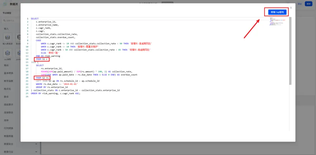 現在我們要進行一個複雜分析,除了之前我們綜合使用各個節點進行處理,可靈活使用「高級SQL」節點,直接編寫SQL語句進行處理,兼顧靈活性和效率。在這段查詢SQL中,將針對納税增長率的排名和收繳率兩個指標對企業進行打標。例如,如果增長率排名小於等於10,同時收繳率又小於90%,標記為“高增長-高逾期風險”的企業,招商或客户部門應主動介入,瞭解其是否存在經營困難,防範壞賬風險。最後我們會得到一份預警清單。