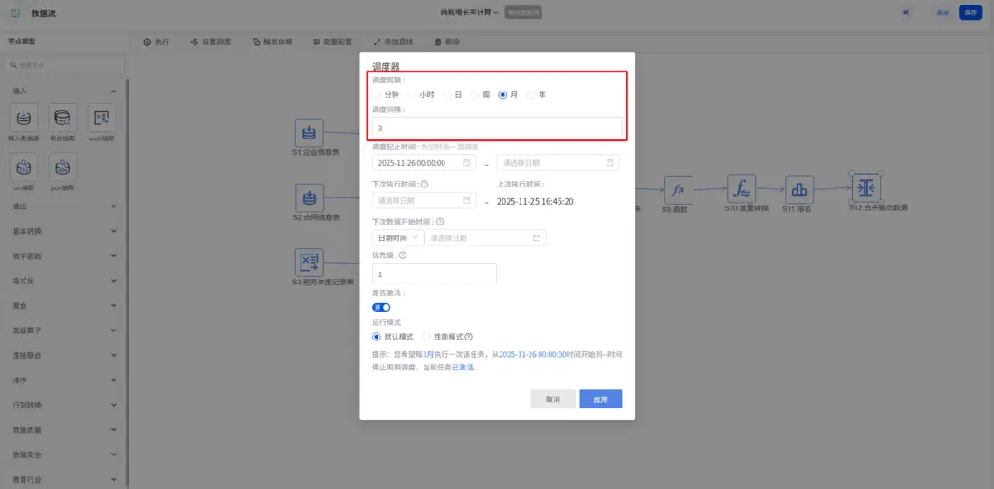 更便捷的是,還支持設定「定時調度」,比如每個季度執行一次,設定起止時間,實現數據自動處理,無需人工重複操作。
