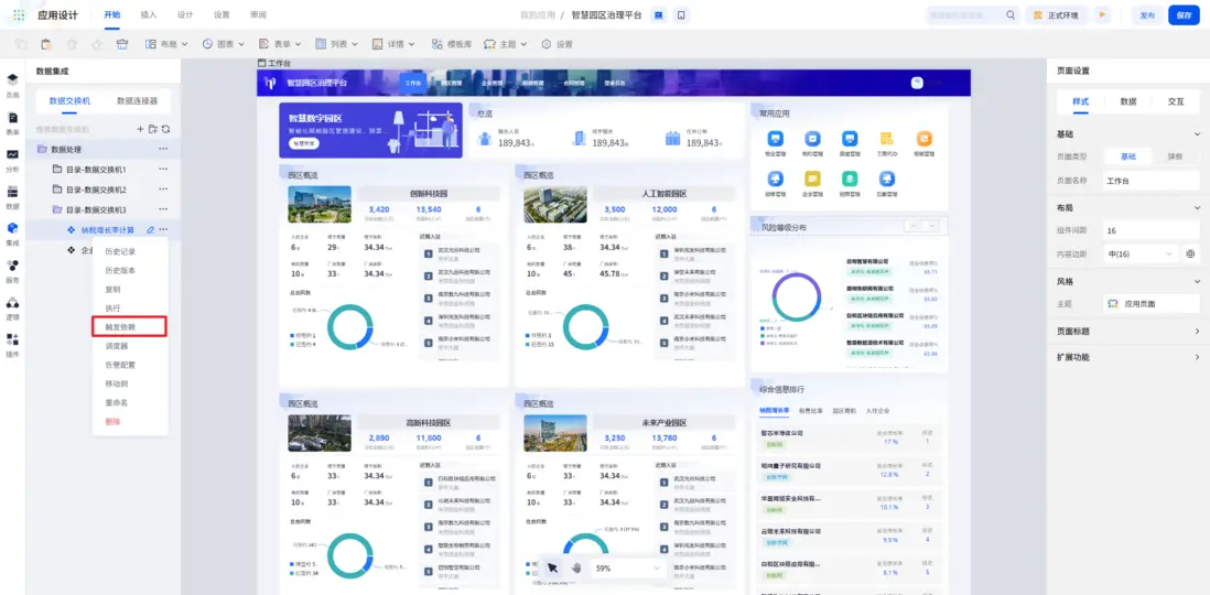 完成數據輸出後,來到智慧園區應用中,進行可視化展示。在工作台頁面的畫布列表中,綁定剛剛生成的資產表。預覽後,可以看到排行榜中直觀展示了不同園區每家企業的納税增長排名和對應的增長率。