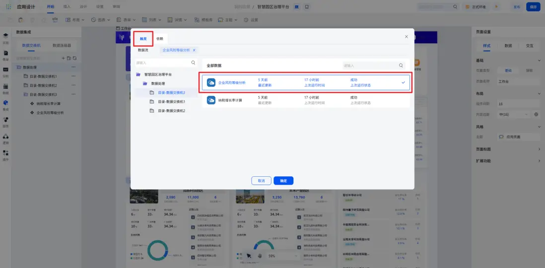 現在已經完成了企業風險等級的分析。我們發現該交換機數據的執行是依賴於前一個交換機輸出的納税增長率資產表,所以在應用配置頁,選中一個交換機開啓觸發依賴,即一旦納税增長率的交換機執行完成後,會立即自動觸發第二個交換機的執行任務,將兩個分析階段無縫銜接,形成一個連貫的自動化管道。