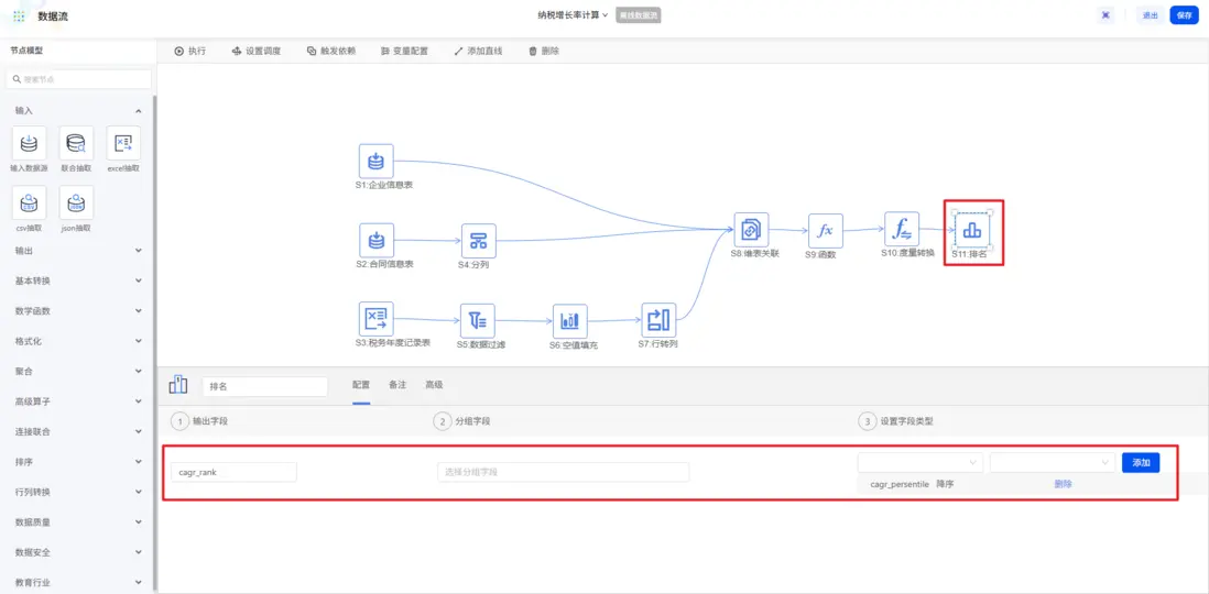 數據整合到位後,進入核心的指標計算環節。通過「函數」節點實現複雜運算,平台內置多種 sparkSQL 函數,無需專業編程能力,只需輸入計算表達式,即可快速完成納税複合增長率計算,非常簡單!