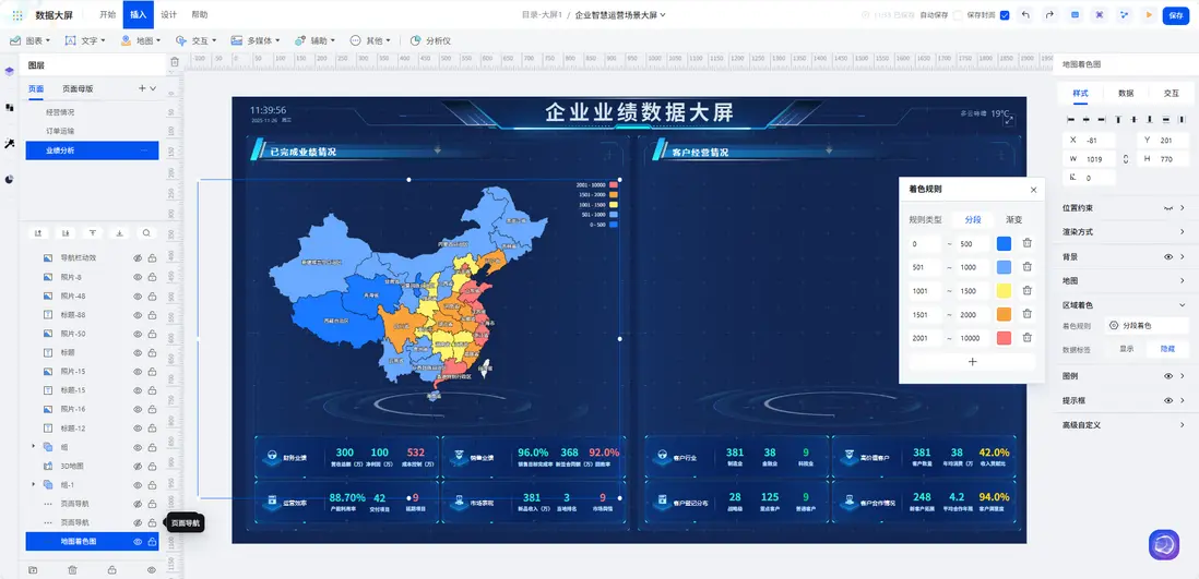 首先在左側區域拖入着色圖組件。綁定全國各省的業績完成數據後,設置着色規則,實現從深藍到紅色的平滑過渡,直觀反映業績高低分佈。深色區域代表業績完成良好,淺色區域則需重點關注,管理者一眼便可掌握全國市場態勢。