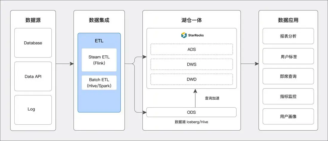 - 數據湖查詢加速: 將 ODS 層數據寫入數據湖中,DWD、DWS、ADS 層則存儲在 StarRocks 中。