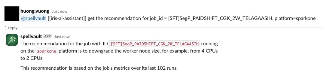 為了讓這些洞察更加便捷可用,我們將推薦系統集成到了 SpellVault(Grab 的生成式 AI 平台)應用中。這樣,用户可以直接在 Slack 上與推薦系統交互,無需頻繁訪問 Iris Web 界面,也能隨時獲取任務性能信息和優化建議。