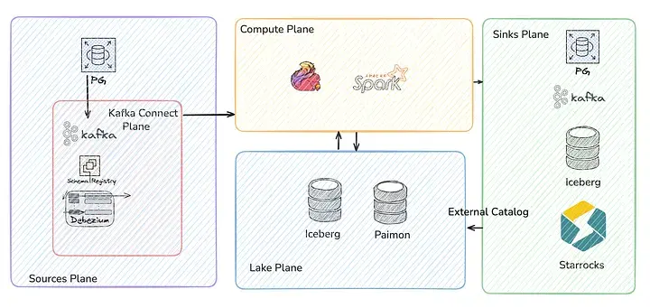 (Fresha 的高層數據流如下:以 Postgres 為主的數據源通過 Debezium + Schema Registry 接入 Kafka;計算層使用 Flink 與 Spark;湖倉層採用 Iceberg + Paimon;下游由多個 Sink 承接,其中 StarRocks 作為統一的 SQL 查詢入口。StarRocks 通過外部 Catalog 訪問湖倉數據,計算層則分別服務實時與歷史鏈路,對湖倉進行讀寫。)